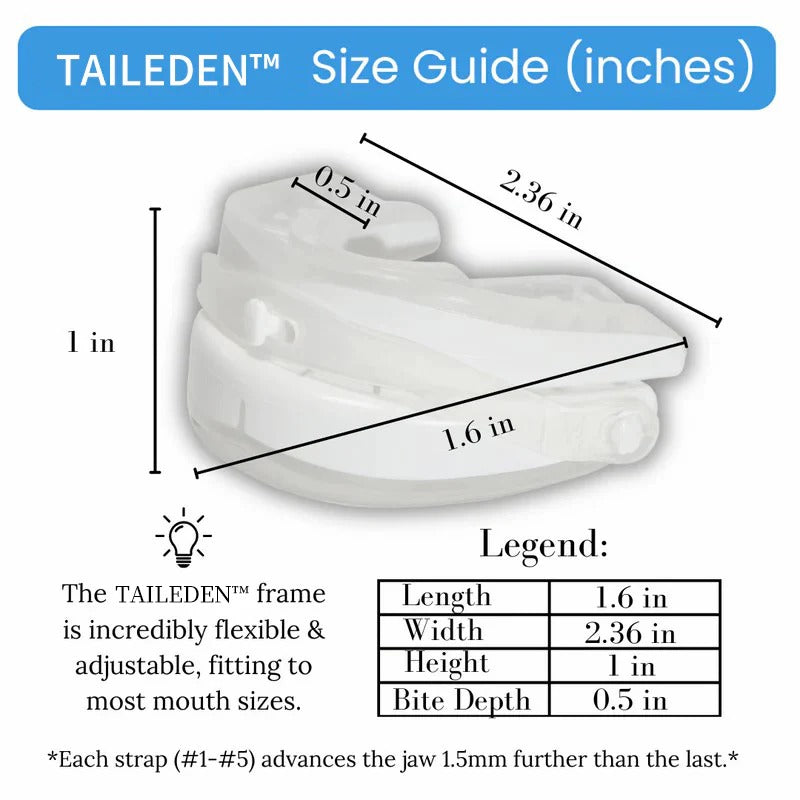 The TAILEDEN™ Anti-Snore Mouth Guard+ gently advances your lower jaw forward. helping to open your airway for smoother breathing and quieter nights. It uses a simple boil-and-bite method to mold precisely to your mouth. ensuring a snug. comfortable fit. The adjustable strap keeps the device in place while allowing natural jaw movement. so you can speak or drink without removing it. Made from high-grade biomedical materials and backed by proven success in Europe. this FDA-cleared solution is now trusted by thousands across the U.S.